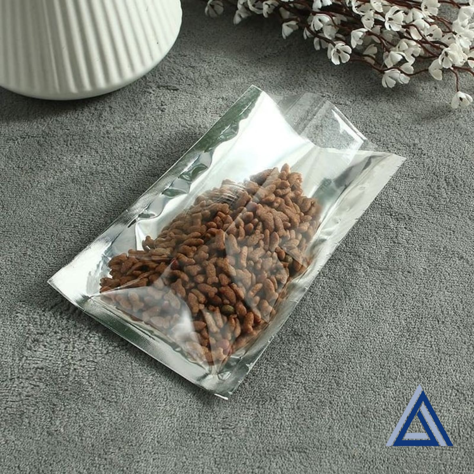 Semi-silver gusseted flat-bottom bag with ziplock closure. Durable, stylish, and perfect for storing snacks, coffee, and specialty products while keeping contents fresh.